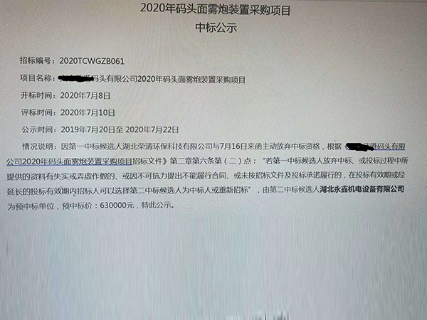 湖北永鑫机电设备有限公司《雾炮中标公示》